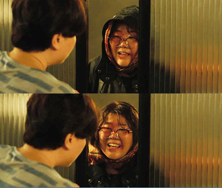 第一次妈妈建议张贴禁止小便的贴士时候,爸爸拒绝了,在女儿告知要吼一吼的时候,又拒绝了,这是一场很有意思的戏,表现了父亲的隐忍性格,儿子也很是无动于衷,直到儿子富有的朋友敏赫前来呵斥,才大赞说“很有魄力,果然是大学生”。但其实呵斥醉汉随地小便和学历压根就没有什么关系,而且他们作为地下室主人更有理由呵斥,只不过他们作为穷人阶级,内心比较怕事、卑微罢了。