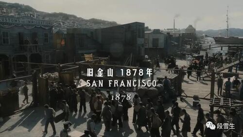 剧集伊始,华工鱼贯走出集装箱,主角阿生也跻身其中。全景下,白色字幕写着清晰的几个大字“1878年旧金山”。