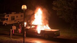 《陌生人2》剧照公园确实是一个有趣的选择,比起一般凶手闯入家中的杀人电影,露营车公园更有美国特色。
