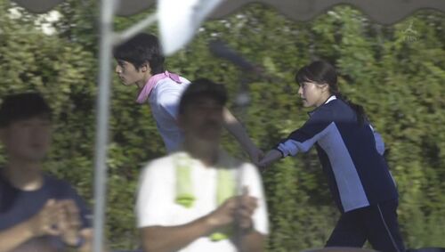 3、在那么多人的校园里,师生牵手,竟然没人注意到?不知道大家有没有留意到一个细节。被圣刻意忽视后,他生气了,但是并没有马上行动,而是环视了周围,应该是确认了所有人的注意力都在二年级的接力赛,他才去拉老师的手的。