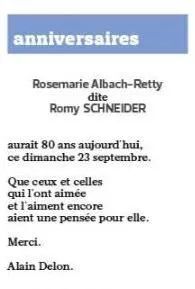 “罗斯玛丽·阿尔巴赫-莱迪,即罗密·斯奈德,9月23日这个星期天即将80岁了。愿那些曾经爱过她、仍然爱着她的人,还能想着她。谢谢。阿兰·德龙。”