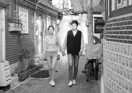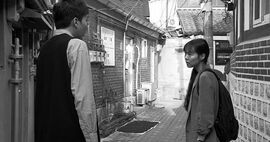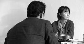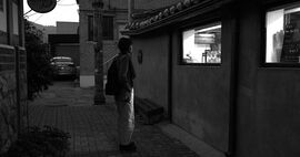 洪常秀虽喜爱元叙事,但总是让“作者”和“人物”绝缘。在一部典型的洪常秀电影里,我们可以看到突然插入的写信镜头,作者的半身,再无其他。信中的故事在另一时另一地发生。人物总被一个独断的漫不经心的上帝摆布,如《自由之丘》中信纸被打乱。而在此片中,作者金敏喜竟然和人物处在一时一地,她看,她忧伤,她咏叹,确实地被人物所影响。这抹去了洪的几分后现代意味,而显得有些现代主义,几分近似《野草莓》。