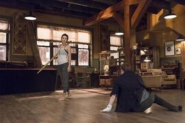 科林出右腿踢陈武,被其夹住右腿扫倒左腿然后被控制的情形出现两次,第一次完全没想到陈武这么厉害,靠斧头帮主夫人废了陈武一只眼才逃脱;第二次仍然被夹住右腿要扫左腿的时候科林左腿腾空用了类似黑寡妇的招数反制陈武,动作相当漂亮~