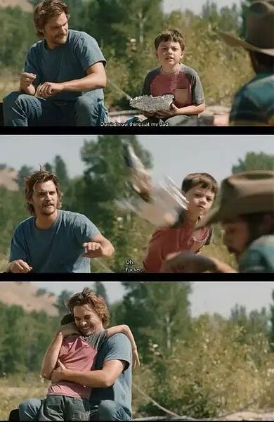 这不是很正常嘛?可你看下一幕,当大哥和凯斯打闹,超他扔石头时,小达顿则奋起反击——