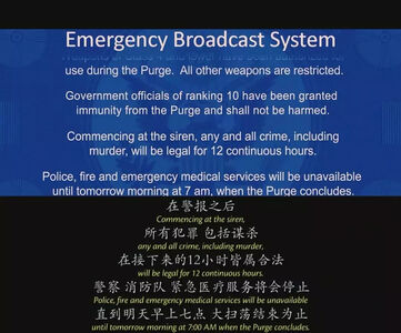 意思就是,12小时内,你可以为所欲为,大开杀戒。相应的,所有人(除了部分重要人物仍受保护外)都得靠自己活下来。