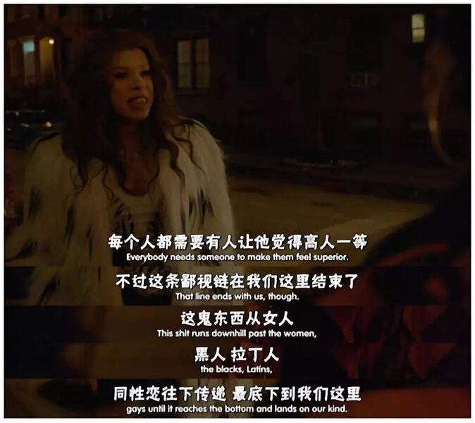 主角Blanca去gay吧不能得到任何服务,不仅被保安扔出门,甚至还被警察以扰乱治安抓进警察局;全剧最美的Angel爱上白人青年斯坦,但在两人亲吻之后,斯坦回家疯狂刷牙漱口,因为他觉得这是“恶心”,是对主流的背叛。