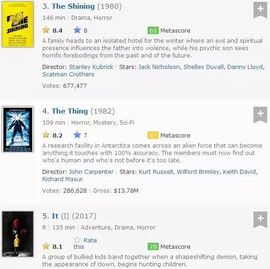 在烂番茄85分,Metacritic70分,都表现不俗。但你要知道,在IMDb,评分过7的恐怖片就是佳作,评分超8分,人数超2.5万人的恐怖片更不超过20部。恐怖类型片下,《小丑回魂》跻身第五,排在它前面的是两部经典:[闪灵]和[怪形]([闪灵]也是根据史蒂芬·金小说改编)。