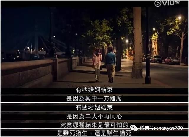 陈奕迅的旁白里面有一句话:有些婚姻的结束是因为其中一方离席,有些婚姻的结束是因为两个人不再同心。究竟哪种结束是最可怕的?是虽死犹生,还是虽生犹死。