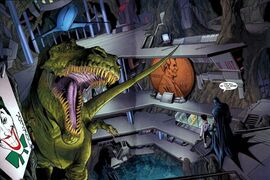 细心留意蝙蝠洞中的收藏品,你会发现一个巨大的硬币和一头霸王龙,这都是老爷在漫画中常见的收藏品。霸王龙首次出现在漫画《蝙蝠侠》第35期,老爷和罗宾来到了一个到处是机械恐龙的岛屿,后来老爷把其中的霸王龙带回家里收藏。