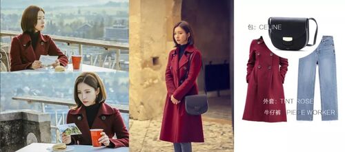在剧中,郑海拉作为旅社职员在斯洛文尼亚出差。造型则配合了背景古城的异国风情,选用了玫瑰紫色TINT ROSE的外套,背包选择了CELINE TROTTEUR 小号,显得人物形象温柔甜美的同时充满了优雅与沉稳。比起选择则黑色而选了水洗蓝,调节上身配色的同时,丰满开朗人设。