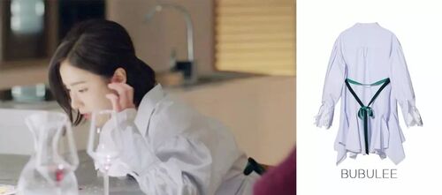 3.衬衫的一万种可能性第三集海拉这件衬衫被韩网博主疯狂推荐。配合着角色的清纯感,大剪裁的立领与大花边袖更加显得人物形象的娇小与柔弱,看似简单的oversized衬衫背后暗藏小细节,腰带选用了祖母绿丝带,更加显得身形纤细。人物角色灵动感十足。