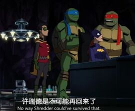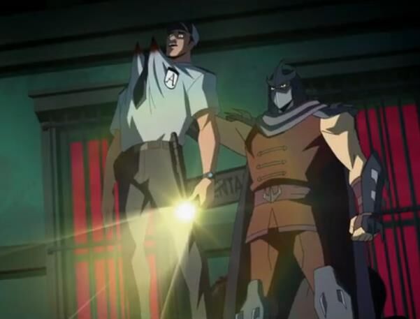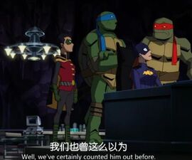 其实感觉这一部打斗的帧数也不太够,大概是经费问题。我之前看到有龟蝙联动动画消息出来时还期待能是乌龟和新52动画宇宙的老爷联动,那个画面看起来舒服些。