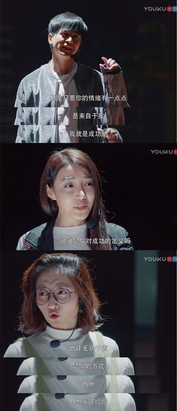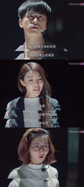 纵观整段我们不难发现,毕十三与许连翘的念白内容其实是在问答和争论的(尽管我们都知道毕十三不是在好好演戏233),但是眼镜念白所表现的明显是她在旁观毕十三和许连翘所产生的心理活动(或者她和他们并不在一个空间),总之就是那两个人并听不到她的念白因此从来没有接过她的话茬。眼镜的念白,既是代表暗恋散步社社长的她自身,也代表了幕后红了眼眶的洛雪——在毕十三眼里,永远都只有顾一心一个人,其他人说的,他都置若罔闻。