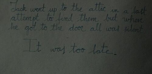 Jack拿出装有赃款的木盒与父亲对话,让其远离房子,父亲将枪留在树后,两人来到岩洞对峙,父亲攻击Jack,被Jack用刀刺伤声带,之后父亲将Jack推下悬崖,刀和木盒被遗留在岩洞。Jack醒后拿着树后遗留的枪,返回阁楼,父亲已在其中,弟妹遇害。Jack悲伤过度分裂人格,砌墙堵住阁楼木门和烟口,将父亲困于阁楼。