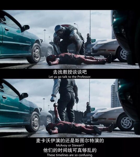 死侍最大的特点就是嘴炮,比如钢力士叫他去见教授,死侍却说:麦卡沃伊演的还是斯图尔特演的?他们的时间线真乱。