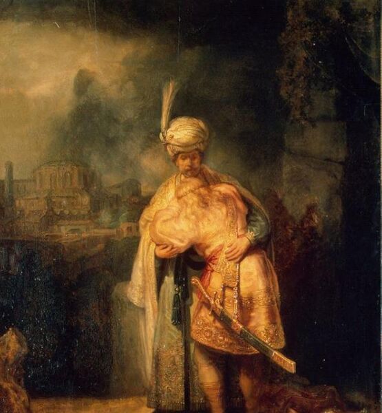★伦勃朗传世油画作品《大卫与约拿单 》中,约拿单正伏在大卫的胸前,痛不欲生,大卫抱着他一脸的柔和,仿佛在给他安慰。整个画面充满了柔和的金色光芒,再加上约拿单以及大卫身上高贵的服饰,给人的第一感觉是豪华高贵中充满着一丝悲凉。