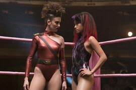 有人说这些女摔跤手在比赛里的角色太浮夸太拘泥于刻板印象——这些角色是制作人Bash设计得。他以金主的身份推翻了Sam起初的反乌托邦女权主义设定,给了摔跤手们一套全新的“接地气”的身份。或许Bash的认知和品味就这么差,或许他只是在迎合广大普通观众的欣赏口味,这套新身份或多或少代表了男权社会对女性发展的桎梏——你想要走出条条框框(如Sam的前卫设想),大多数人不买账,于是节目做不下去,女人什么也得不到。