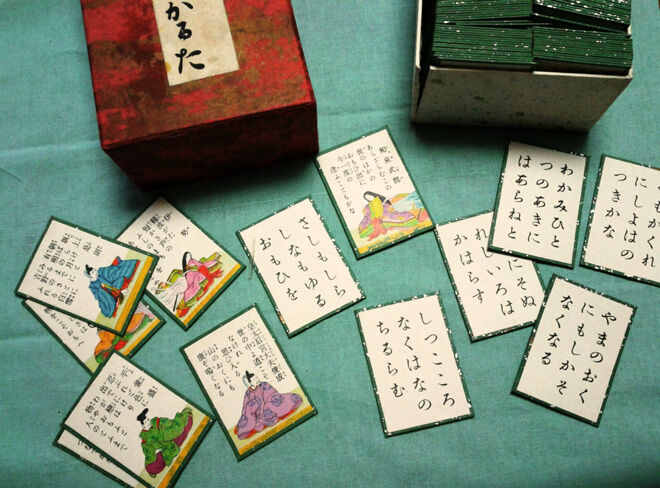 “桌游”歌留多歌留多是一种日本传统纸牌游戏。把和歌(百人一首)写在纸牌上。游戏者用的牌上只写有下句,听读牌的人读上句,找对应的纸牌。可以被认作是古老的日本“桌游”。普通人一般在正月和家人一起玩儿。