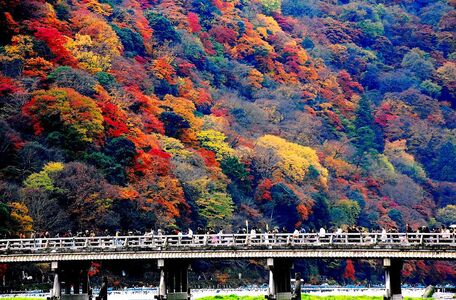 岚山是京都郊外一处赏枫名地。横跨在河水上的一座桥名为渡月桥。
