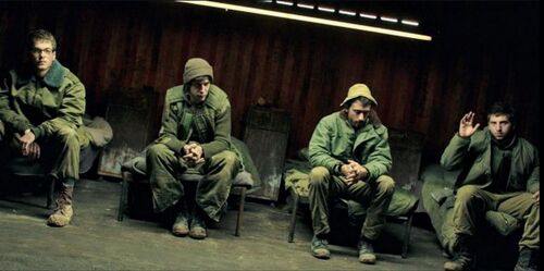 这四个小兵哥要放在美国片里,估计满嘴妈妈叉叉的扎姘头段子和大麻烟。放在苏联片里他们保不齐突然很专业地合唱一段俄罗斯民谣。放在中国片里他们随便哪个一张嘴都能说出许多保家卫国的崇高道理。但他们是以色列兵,格局小了很多,顿时看上去呆滞了:他们并没有怨言,但相互间交流也不频繁,俊俏的大眼睛里是as-matter-of-factly的空洞。除此之外他们在做着一些大约沙漠里的文艺兵才会做的很文青的事情:修复古笨的军用电台,雨夜里放老歌,将父亲和自己的黑暗秘密画成漫画,就着老歌跳艳舞,等等。只有那些时候他们看上去身体和思想才不再属于国家,看上去不再呆滞,开始有了灵性和人格。但这群年轻的,美丽的,有灵性的娃娃兵不管多么纯真和文青,那个时候到来的时候,他们下一秒就会变作杀人机器。眼都没来得及眨一下,就可以把一车同样年轻美丽的男女扫射成马蜂窝,而且理由可以简单淳朴到“不怕一万,就怕万一”。有些人看到这里或许会以他们国民的焦虑感替这几个小兵做解释——天天生活在恐惧与警惕里不容易,毕竟是居住在抢掠来的土地上。可他们一旦发觉闯了祸,很快地又脑子情感统统上缴国库,因为知道会有国家爸爸来擦屁股,脸上复又呆滞的表情。他们自小受的系统训练大约如此。这出戏里并非都是这类任由国家安排的木头人。饰演父亲的国宝级演员阿什肯纳齐演技奇好,他做的Michael是全片最有反骨的角色。小时候偷了老娘从集中营里带出来的希伯来古董圣经去换了黄色画报,长大成人后又将威严的满口德语的母亲送入精神病院。虽然也服过兵役,但他基本的人生走向都是自己的设定。这样的不服管束放在国家民族利益的宏大前提下当然不会有什么好下场——他死而复生的乖乖宝贝儿子,最终还是等于间接死在了他自己手上。