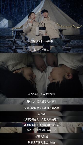 ——雪花落入水中的频率超过五万赫兹,因为匹配不上人类的频道,所以这个雪天还是太安静了,安静到好像只剩下我自己的心跳,安静到明明是拥有六十六亿人口的地球,却好像只剩下我和面前的这个人,希望这个世界可以吵闹一点,好让我假装,从来没有发现过这个秘密。——第七集《不能说的秘密》