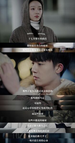 ——十七岁那年的我们,都怀揣着各自的秘密,那些小心掩饰却还是被发现的;那些不愿承认但又欲盖弥彰的;那些明明笃定,可最终还是心甘情愿把它变成回忆的;而这些秘密,这些不能说的秘密,在过了很久很久之后,才被发现是如此雷同,原来他们都关乎于一场不请自来的心动。——第七集《不能说的秘密》