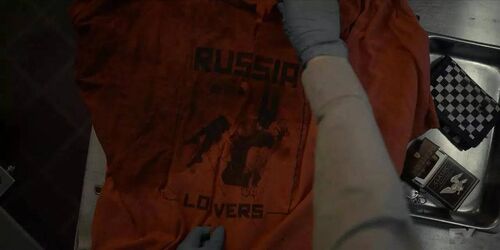 第一集就被空调砸死了的那个龙套,他当时身上的衣服上是Russia Lovers
