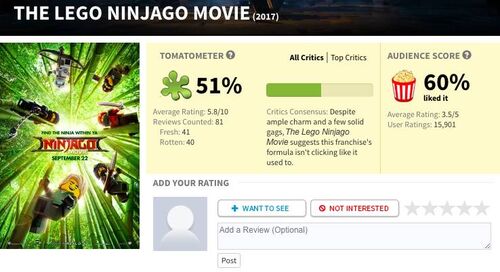 而且对于这部电影,影评圈与观众群的意见也无缝衔接,毫无分歧。根据专业影评人士在烂番茄网站上的综合意见,《乐高忍者》的新鲜度仅为51%,如下图所示,即是并不新鲜(作为参考,今年2月上映的《乐高蝙蝠侠》新鲜度为91%,so fresh~)。