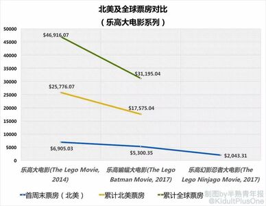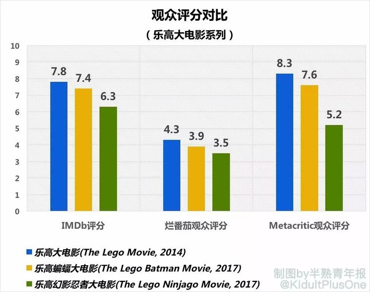 1. 逐部下滑的口碑&票房 根据美国观众最常用的三大影评网站数据显示,乐高系列大电影的评分正在逐部下降,而《乐高忍者》更是创下新低。
