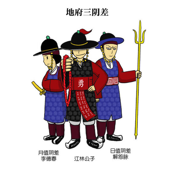 地府三阴差老大江林(河正宇饰)日值解怨脉(朱智勋饰)月值德春(金香奇饰)德春的还原度个人觉得很高!演各位掌管七重地狱的王也都是大牌!(后面会写)