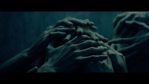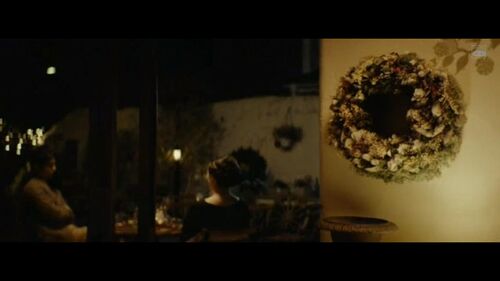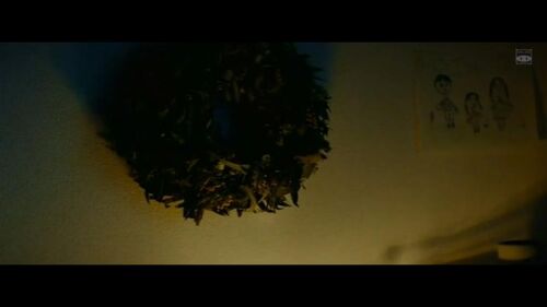 影片开头,田中在凶案发生地勘察时碰上一个来历不明的怪女人,两人谈话结束之后,画面忽然切回案发现场:镜头从屋内玄关处的四双鞋开始,路过昏暗的走廊、探入狼藉的客厅、映出田向的尸体,接着扫过血迹斑斑的楼梯,定格在二楼卧房母女俩遗体附近的一个似圆形花环上——这个花环和咖啡店女老板装饰在室内的圣诞花环几乎一样。
