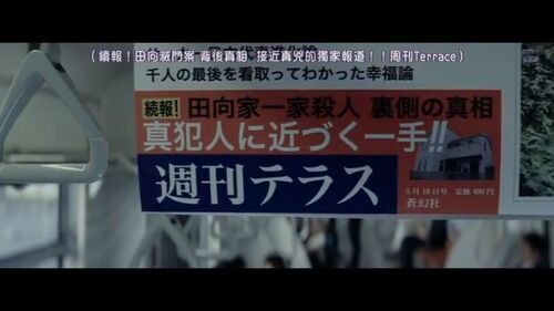 故事围绕被害者田向的家庭展开,外界对他们的评价是“幸福”“融洽”“像童话一样”,而与这个幸福家庭相反,主人公田中兄妹从小遭受家庭暴力,没有享受过来自父母的爱,长大后产下禁忌之果,却重蹈父母的覆辙。无论杀害田向一家的凶手是哥哥还是妹妹,从某种程度上来说,都是一种“不幸”对“幸福”的敌意。身为记者的田中执意追踪此案,除了确认相关人员对真相一无所知外,也是要通过报道揭开田向夫妻“不为人知的一面”,换言之,是要击碎他们在社会舆论想象中的美好形象,告诉世人所谓“幸福”的背后存在多少狰狞和“牺牲”。