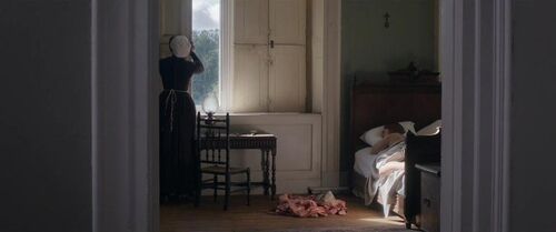1,凯瑟琳的公公被毒死时,导演并没有让我们看到他惨死的过程,而是拍了凯瑟琳邀女仆一起进餐、拉家常。观众可以听到被椅子堵住的门的另一边公公痛苦挣扎、直至彻底安静的全过程。导演拍了一个空间,但同时表现了两个空间的事。——表现了凯瑟琳冷静(或说狠毒)的性格