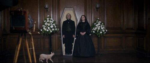 凯瑟琳用丈夫在卧室命令她的台词命令下人:“对着墙、不许笑”(“Face the wall, and stop smiling.”),捣乱的男人们静止站立,女仆趁机跑掉了。