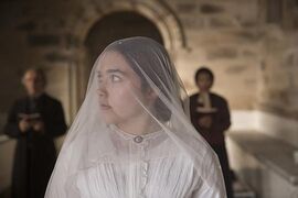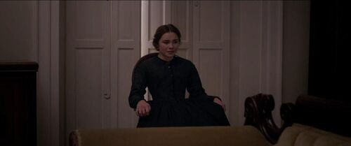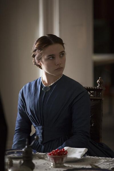 服装造型很好地帮助了皮尤塑造凯瑟琳。白色的棉质睡裙、淡粉色的丝绸家居服;具有象征意义的、令人窒息的塑身衣;与灰蒙蒙场景格格不入的亮蓝色裙子……在剧情的不同发展阶段展现了不同的凯瑟琳。