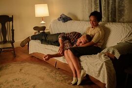 在电影中,男主和非洲裔朋友们喝酒聊天后闷闷不乐地回到家里,醒来的Mildred在床上迎接他,他搂住她,无力又坚定地说着,“I take care of you…I take care of you.(我照顾你……我照顾你。)”