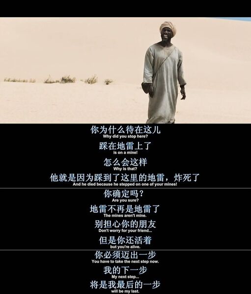 看到这里相信,应该能分辨,黑男在知道脚下踩的"地雷"是自己埋在女儿遇难处的罐子的情况下,鼓励男主,迈出一步不断向前了吧?第二天嘲笑男主害怕,第三天就被男主的坚韧感动,同样鼓励男主向前的情况下,说出了自己的悲惨遭遇(痛失爱女,自己被炸断腿还能“再”娶个护士老婆).悲伤使人反省,这点比话痨队友的"人类一大步"要真切有帮助得多,也明白了男主一直坚毅地在向前走,只是敬畏地到了分岔路,随后开始精彩的心理闪回.