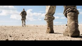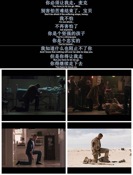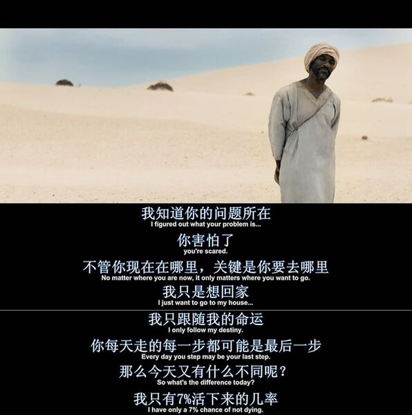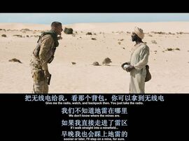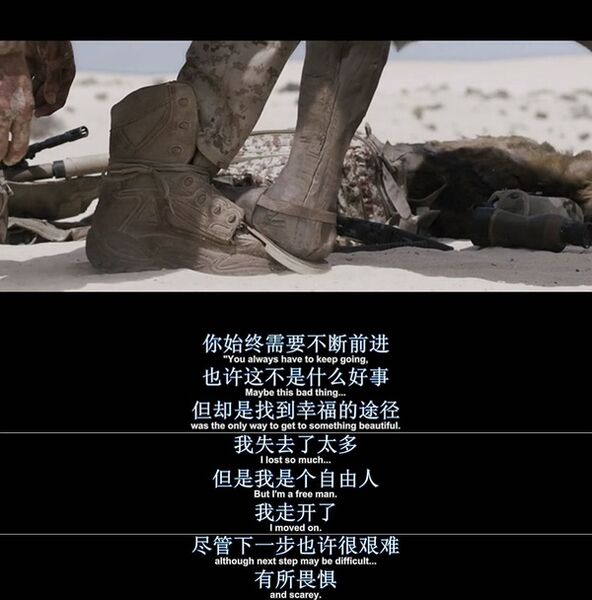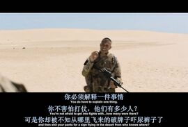 因为警示牌出现大的分歧,也是影片的一个关键节点,话痨男配的职业目的性,在任务的执行上没有和男主构成严重冲突,而在撤退方式上选择了"侥幸",外向的个性也难掩任务失败的沮丧,此时主导进程的喜悦显得严重不谨慎(说实话,这哥们实在很意大利),男主隔着沙漠靴警觉地发现“观察员”小兵,(小女孩儿应该挂在附近)犹豫之间,本职警惕的观察员男配踩到地雷就这么被忽略了(影片中有音效).随后触雷,个人觉得自尽部分在剧情上有明显瑕疵,走向完全可以再躺一会儿失血过多,或者挨到晚上狼出现,甚至和黑男互动也不错.一定程度上保留了军人的尊严,对主配人物塑造整体上却显得突兀.