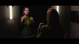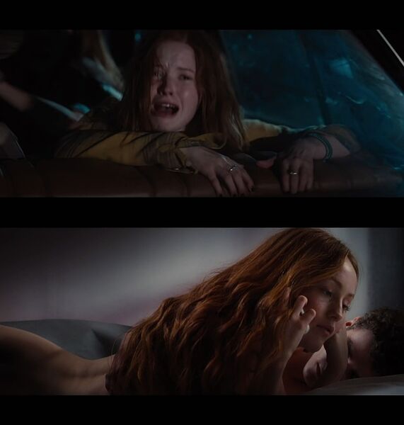 4.红发女郎不难注意到,现实世界的苏珊和她的女儿、小说世界中托尼的妻女全部是红发,甚至扮演托尼妻子萝拉的女演员艾拉.菲舍尔都和艾米.亚当斯长得都很像。这其实也是一种巧妙的心理暗示,再度强调了现实世界和虚构世界的镜像关系。苏珊读到小说里的托尼发现妻女惨死后,立刻吓得给自己的女儿打了电话。这里前后有几乎一模一样的构图出现,一个安静祥和,一个血腥恐怖,观众们立刻忍不住好奇起来——苏珊这个美丽的女儿是她与谁所生?她是不是苏珊与前夫的孩子?她对爱德华的伤害,是否跟这个孩子有关?
