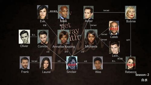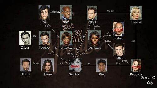 •16. Annalise声称约了Sinclair来Caleb家要把掌握的事实向她全盘托出,并让Caleb离开回避。Bonnie和Asher将Sinclair的尸体带到Caleb家, Annalise告诉Asher Sam案的真相,并要求另外四人帮助Asher。大家串通好供词,Annalise安排Frank找到Catherine并下药嫁祸。Wes感觉事情不妙,打电话通知Nate赶来。 Sinclair尸体被从顶楼丢下造成坠楼假象;