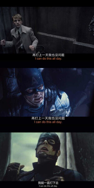 《美队1》中,身体瘦弱的他,对街头混混扬言“我可以打一整天”;即便被红骷髅用枪指着头,他也绝不服软“我可以和你打一天”;《美队3》中,面对钢铁侠的掌心炮,他再一次喊出狠话。