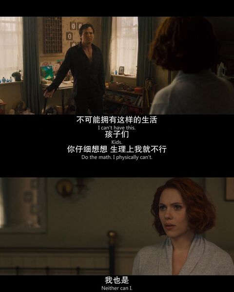 而黑寡妇较为复杂,《复联1》里本以为黑寡妇和鹰眼是一对,结果《复联2》告诉我们鹰眼其实早就有老婆孩子了。
