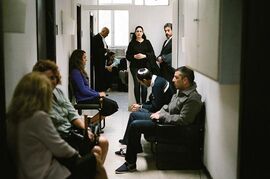 薇薇安在电影中所面临的法庭,就是这样一个宗教法庭。我们在电影中,也可将这个法庭做一番打量。从偶尔扫向法庭之外的镜头中,我们可以看到,到这样的法庭中处理婚姻的夫妻还不少,很多都在外面排队,等待着宗教法官的召唤。而法庭则设于一间小小的房间之内,三位年龄颇大的拉比作为法官高居其中,而原告与被告席则列于旁边,坐着原被告及他们的律师。证人席只是一个小小的桌子,位于原被告席之前。法庭内没有旁听席,无关人员不准入庭,而作完证的证人也得马上离开法庭。