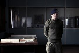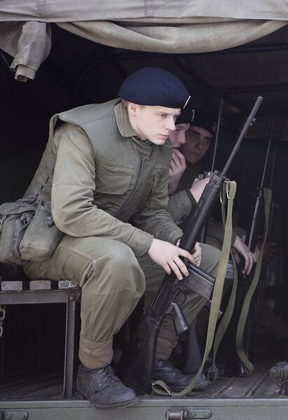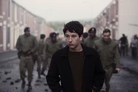 本文部分刊载在《看电影》2014年1月中评分:B-尽管在2014年初的柏林电影节上并无重大斩获,导演扬•德芒特(Yann Demange)聚焦于北爱尔兰问题的剧情长片处女作《71年》仍然赢得了媒体的口碑,并助其以“新导演”身份入围了欧洲电影奖“年度发现奖”的五位提名者之一。有意思的是,同样是在柏林电影节,同样是关于北爱尔兰的武装冲突,德芒特的这部处女作在时间上看,可以被视为是英国导演保罗•格林格拉斯(Paul Greengrass)2002年勇夺金熊奖的《血腥星期天》的前传。然而,电影理念上的区别,使得这两部同一题材影片走向了电影创作中截然不同的两个方向。如果不是因为U2那曲《Sunday Bloody Sunday》,北爱尔兰问题对于绝大多数国人,仅仅只是90年代常见诸于报端和电视新闻里的一个熟悉的专有名词。且出于一种思维惯性,人们很自然将其与抗议、分裂、爆炸、恐怖主义等词汇分装在一个框里——一个尚处于水深火热中的世界,一种经久不息的罪恶——但却与我们绝大多数人的生活毫不相关。也正是在这点上,人们褒扬U2,因为他们用歌声重建了一种感性的政治,引导大众跨越冷漠的电视新闻而将摇滚之爱投注到对世界的爱中。因此,当电影也试图在这个题材中寻找灵感时,对于每一个作者而言,最首要的,也是最直接的创作现实只能是政治现实以及与此现实相对应的政治立场。北爱尔兰问题从最根源上说,是殖民化过程中的宗教冲突。十六世纪宗教改革期间,英国人脱离罗马天主教,改奉新教;而爱尔兰人则坚守天主教信仰。爱尔兰北部的阿尔斯特省作为苏格兰、英格兰新教徒的主要移民地,成为新教教徒与天主教教徒爆发宗教冲突的主要区域。这一冲突以英格兰新教徒对爱尔兰全岛的政治统治而告终,并在历史上引发了数次对天主教徒的血腥屠杀和长久的政策性歧视。第一次世界大战后,爱尔兰独立运动高涨。新芬党在战后第一次大选中大获全胜,挟民意径自宣布成立共和政府,并组建爱尔兰共和军(IRA)抵抗英军,爱尔兰陷入内战。1921年,爱尔兰迫于形势签订英爱条约。南方二十六郡以都柏林为首府,成立爱尔兰自由邦,在英国监督下获得名义上自治自决权以结束英国将近七百年来的殖民统治;而北方新教徒联合派占主导的六个郡则自决留在联合王国内部,在贝尔法斯特设议会实行自治,成为北爱尔兰。南北分治的局面遭到了爱尔兰民族主义者的激烈反对,以爱尔兰共和军为代表的激进派不惜以武装暴力方式来达成爱尔兰民族及全岛的统一。1968年后,受全球范围内民权运动的激励。面对独揽政治权力的新教徒族群,北爱尔兰的天主教徒发起了保障其自身权益的民权运动,却遭到新教徒的武装反制。天主教徒抗争导致北爱尔兰局势日趋严重,终于酝酿出族群间的大规模流血暴乱。英国政府逐派遣英军进驻北爱维持治安,但遭到爱尔兰共和军的武力袭击,北爱尔兰再度陷入内战漩涡。1972年1月30日,英军在北爱尔兰民权游行过程中射杀14名平民,酿成“血腥星期天”事件,标志着这一轮抗争的历史性高潮,并引发了爱尔兰共和军在其后对北爱尔兰,乃至大不列颠本土的长期恐怖袭击。而这一事件作为上世纪七十年代民权运动中最大丑闻,也成为众多艺术家创作中经久不息的主题,用于表达他们抵抗专制,宣扬自由以及平等的呼声。相比于格林格拉斯将镜头直接对准“血腥星期天”,并以“跳切”配合平行剪辑的“不规范”手法逼真地在三十年后,重现了发生在1972年的历史性事件。德芒特在他的处女作中则展现了一个学院派“优等生”的非凡品质。丢下了历史性书写的沉重包袱,导演以一个“拯救英国大兵”的虚构故事重建了1971年北爱尔兰首府贝尔法斯特的血腥“战场”。影片以小切大,以英国新兵加里在北爱尔兰一天一夜的遭遇为剧情主线,并从加里所在部队一组运动感十足的日常训练中拉开序幕,在电影伊始即为全片紧凑连贯的节奏定下了基调。但与随后极度危险的处境相比,这群马上就将发往北爱尔兰维持治安的士兵们显然对他们任务的艰巨性毫无意识。“记住!你们并没有离开英国国土!”,士官的一席话似乎不仅仅是一种政治标语式的剧情铺垫还似乎向这群二十岁出头的毛头小伙传递着一种错误的幻觉,好像他们将要面对的仅仅是同胞内部的小打小闹,是去“利兹”市处理足球流氓这样的小问题。而加里的弟弟则显得更有先见之明,在与加里分别的那一天,他忧心忡忡满腹心事样子,换来了哥哥“一定会回来”的俗套承诺。空荡荡的马路,随处可见的路障,街边尚未燃尽还冒着火光和烟尘的汽车,清晨的贝尔法斯特如若再配上连绵不绝的枪声,就和新闻里战火纷飞的中东别无二致。正如北爱尔兰的局势一样,这座城市根据宗教和政治倾向的区别一分为二,马路这边是亲英国的联合派新教徒定居点,而马路那边就是极度危险,对于英国士兵绝对不能深入的天主教徒居住区域。加里所在部队的任务就是要协助控制抗议的平民,保证军方能搜查和逮捕那些持有武器的极端民族主义者。正是这种不经审判,就逮捕和关押的制度,引发了1972年在德里民权组织的游行和随之而来的血腥惨剧。尽管英国在这场政治冲突中似乎扮演着中立的第三方,即仅维持地区的安全局势,但不介入到对峙双方的政治冲突中。但事实上,加里所在英国部队却面临着全民皆兵的严峻处境。孩子们用