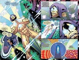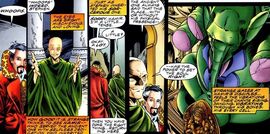 生命法庭的权杖Mordo在训练Strange时,提到了各种封印了法术的神器,其中就包括“生命法庭的权杖”(Staff of the Living Tribunal),表面上是一支铁棒,其实是一支会发光的铁棒。在漫画中实际上没有出现过这个武器,但确实存在一个叫做“生命法庭”的角色,在漫威多元宇宙中负责监管所有次元的平衡,在一定意义上代表了多元宇宙本身,是一个抽象意义上的存在,但也会以实体化的形象现身,奇异博士便是第一个与它接触的人类角色。它的外形接近人类,拥有三张脸,穿着风格与DC的曼哈顿博士非常相似。