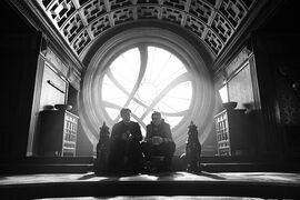 WIFI密码这个在预告片中就被“剧透”的笑点,毫无意外地在影片中出现了。Strange在Kamar-Taj被安排到一个卧室,师兄Mordo贴心地递上一张纸条,上面是房间的WIFI密码:shamballa(我怎么想到了巴拉拉小魔仙)。致敬了奇异博士漫画《Into Shamballa》,故事讲述Strange面临抉择:可以帮助世界进入黄金时代,但必须牺牲大部分人类。另外香巴拉是藏传佛教中所说的理想圣土,呼应了漫画里的宗教文化来源。