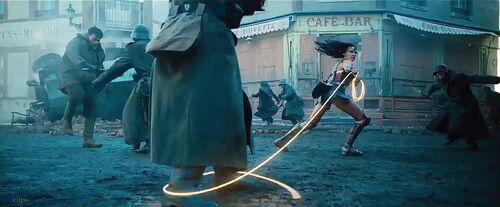 神奇女侠以史蒂夫的“秘书”身份加入一战,现身战场,以一敌百。