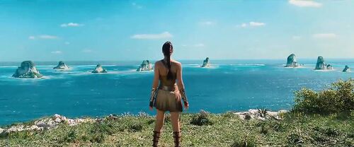 电影并没有采用漫画经典的“天堂岛大使”护送史蒂夫回英国的桥段,而是神奇女侠独自决定和史蒂夫来到人类世界,并帮助人类保卫和平。