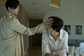 Kevin生病是全片中母子关系最和谐的一段。平时Kevin对母爱的渴望表现得令人难以接受,生了病倒像个普通小孩一样赖在妈妈胸前听讲故事,连爸爸都不要了。Eva特开心地笑了,Kevin仰头盯着她就像看着一个暗恋许久的人一样。可病一好,倔强让人读不懂的Kevin又回来了。