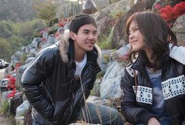 电影一开始就充满了喜剧色彩,男主(暂时成为D)瓜瓜的,女主(May,都是假名)很秀气笑起来很甜。配角们也都演出卖力,特别有煽动感的导游,被人一说就大哭的小女孩,长相富态但是很有爱的情侣,让你想不开怀都难。印象中最最博得全场大笑的几个情节,一个是D站在冬季恋歌的拍摄地,借用裴勇俊的雕塑大玩双簧。那个时候觉得他还是属于玩世不恭的浪子,厚着脸皮粘着May,玩这种傻乎乎的游戏。